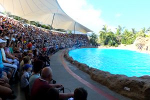 Schauen wir über den Tellerrand der Spezies und etwa auf Tursiops truncatus. Hier hat man im Loro Parque das Lagunenkonzept, das einen Strand nachbildet – ein häufiger Lebensraum der Tiere. Man hat eine Abgrenzung zum Publikum durch niedrige Felsen, aber zum Beispiel auf dem Beckenboden würden sie das Bild nur stören, weil es nicht zur Strandthematik passt.