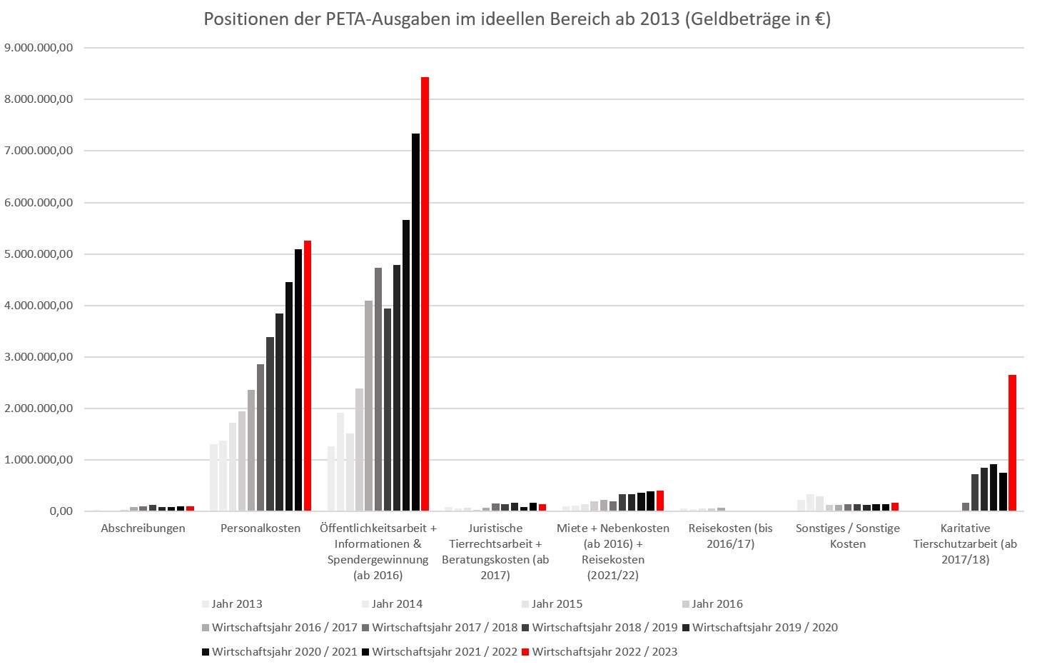 Dass das nicht so glaubhaft war, fiel PETA im Wirtschaftsjahr 2021/2022 vermutlich auch mal auf. Just wurden die Reisekosten in die „Miete“-Position eingegliedert, ohne aber, dass es eine wesentliche Trendwenden in der Entwicklung der Position gab. Also große Reisetätigkeit kann es da vorgeblich dann auch nicht gegeben haben. Im Wirtschaftsjahr 2022/2023 fehlen die Reisekosten dann wieder und die „Karitative Tierschutzarbeit“ ist plötzlich signifikant mehr als zuvor. Schon das zweite Mal fielen also Reisekosten weg und plötzlich macht man angeblich mehr Tierschutz? Hier an Zufälle zu glauben, könnte man schon als tollkühn bezeichnen.