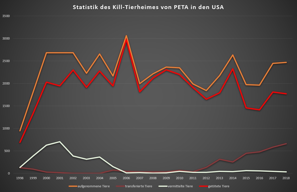 PETA ist ein so genanntes „kill shelter“. Anders als „no-kill shelter“, euthanasieren sie nicht nur, sondern töten auch, wenn es nicht medizinisch indiziert ist – etwa aus Platzmangel. In Deutschland wäre das Betreiben eines solchen Tötungstierheims nicht legal. Das Problem, das viele mit solchen „kill shelter“ haben, ist, dass in solchen Tierheimen auch Tiere sterben, die vielleicht noch gesund und vermittelbar gewesen wären. In den USA ist das aber leider legal. Normalerweise haben „kill shelter“ eine Tötungsrate von rund 40%. PETA hat in diesem Jahr eine von über 70%. Der Durchschnitt der letzten Jahre liegt bei über 80% – also dem Doppelten von „normalen“ Tötungstierheimen.