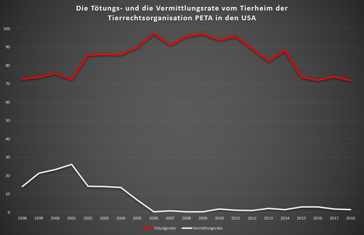 Die Zahlen des PETA-Tierheims wurden von der zuständigen Behörde veröffentlicht: Eine Tötungsrate von rund 71% steht einer Adoptionsrate rund 1,4% gegenüber.