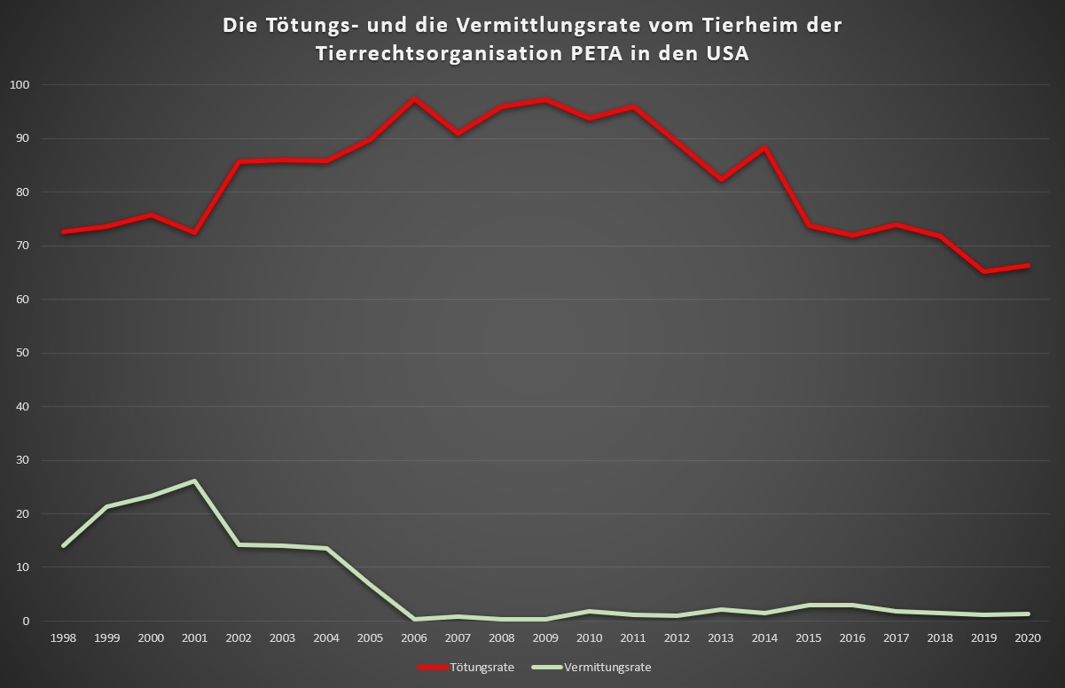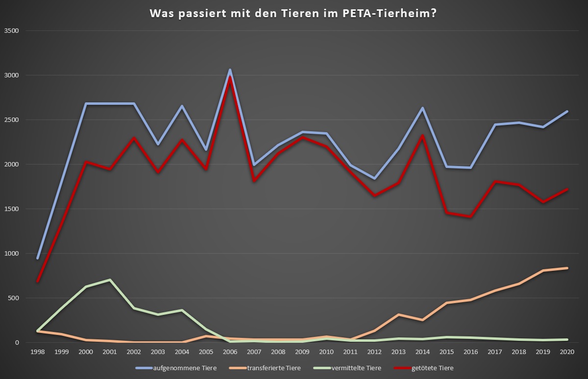In den letzten Jahren hatte PETA versucht durch Transport der Tiere in andere Tötungstierheime die Tötungsrate des eigenen Tierheimes zu verringern. Allerdings dürfte das wohl meist nicht wirklich anders verlaufen sein als in dem gut dokumentierten Fall von einigen Kätzchen, über die wir berichteten. Dadurch entsteht die seit Beginn der 2010er Jahre abfallende Kurve der Tötungsrate. Das heißt aber nicht, dass man deshalb automatisch in absoluten Zahlen weniger Tiere töten würde. Vielmehr sah man im vergangenen Jahrzehnt eine immer wieder steigende Kurve, die auch 2020 fortgesetzt wurde. Insgesamt tötete PETA, seit die Aufzeichnungen veröffentlicht werden (Mitte 1998), über 40.000 Tiere – das sind über 80% der von PETA in diesem Zeitraum aufgenommenen Tiere.