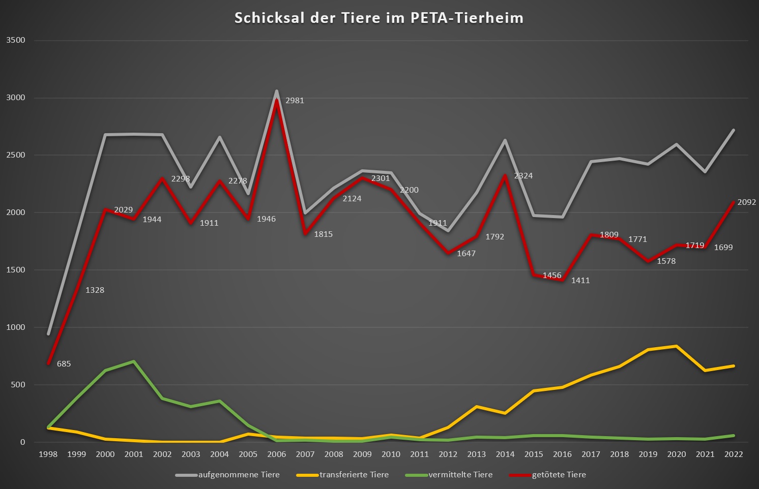 Jährlich ist PETA verpflichtet die Tötungszahlen der zuständigen Behörde zu übermitteln. Das wurde Anfang des Jahres 2023 auch für das Jahr 2022 getan. PETA hat in diesem Jahr deutlich mehr Tiere aufgenommen als in den letzten Jahren – die Kurven für die in andere Kill-Tierheime gebrachten Tiere und für die Vermittlung aufgenommener Tiere sind aber kaum merklich angestiegen. Dafür hat sich die Zahl der getöteten Tiere mehr als deutlich erhöht. Das bedeutet, dass wieder viele auch gesunde und vermittelbare Hunde, Katzen und andere Haustiere starben.