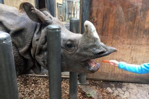 Dem Panzernashorn mal eine Karotte reichen: so nah kommt man dem Lieblingstier beim entsprechenden zoopädagogischen Programm des Tiergarten Nürnberg. | Foto: Nicola Ohnemus